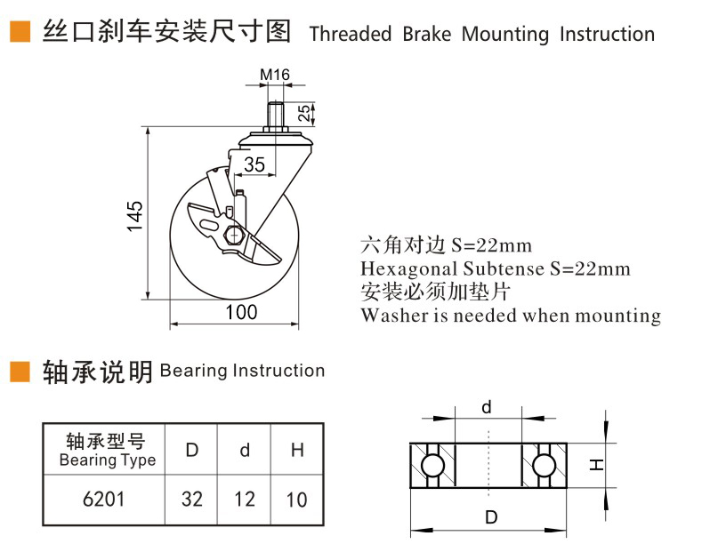 JARABO High elastic 4" 300kg Threaded Side Wheel Brake TPU Caster J64544C-H644-86A/C